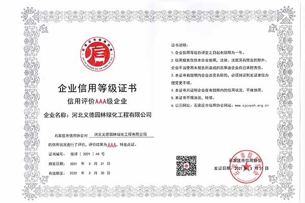 近幾年來(lái)我公司被授予2019年-2022年河北省扶貧龍頭企業(yè)、2018年國(guó)家林業(yè)標(biāo)準(zhǔn)化示范企業(yè)、2019年度全國(guó)苗圃50強(qiáng)、2018-2019年度河北省林業(yè)重點(diǎn)龍頭企業(yè)、2018年保定市精品特色現(xiàn)代農(nóng)業(yè)園區(qū)、2018年度保定林木種苗協(xié)會(huì)授予特色苗圃、2018年度北方十佳特色苗圃、2016-2019年河北省建設(shè)工程招標(biāo)投標(biāo)誠(chéng)實(shí)守信5A級(jí)施工企業(yè)等榮譽(yù)稱號(hào),2017年保定市林木種苗龍頭企業(yè)、石家莊市2017年度優(yōu)秀園林企業(yè)。